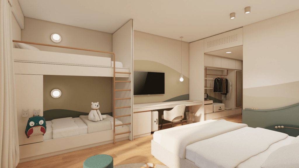 Manželská postel (180x210 cm), možnost přistýlky (80x200 cm), koupelna se sprchou, TV, minibar, kávovar, klimatizace, trezor, balkon s výhledem na les nebo panoramatickým výhledem.Rodinný pokoj Comfort