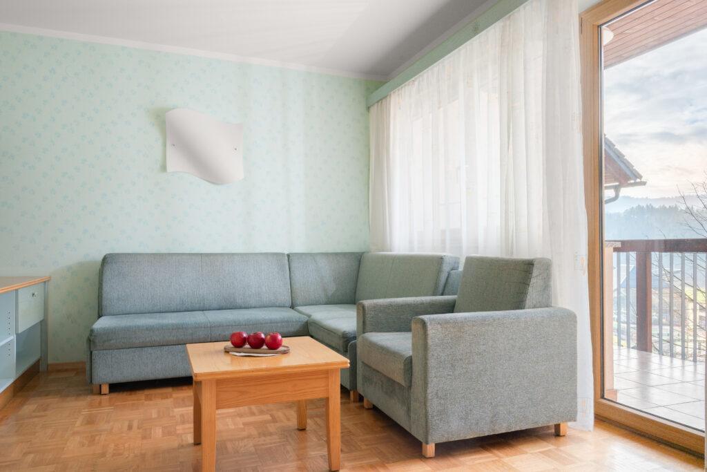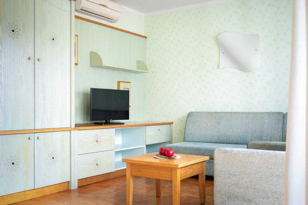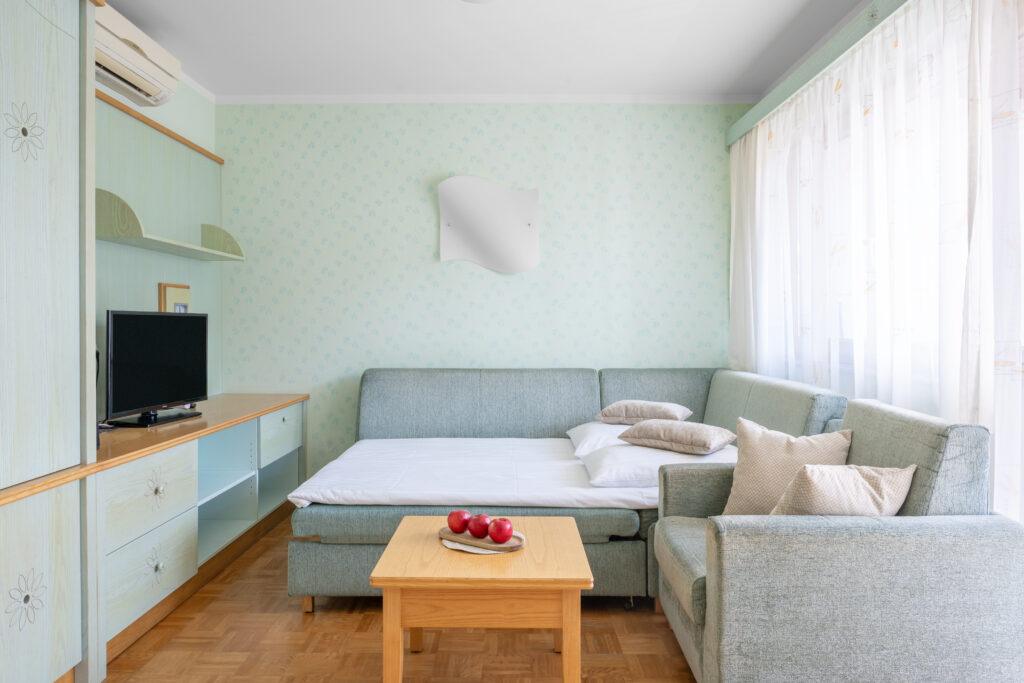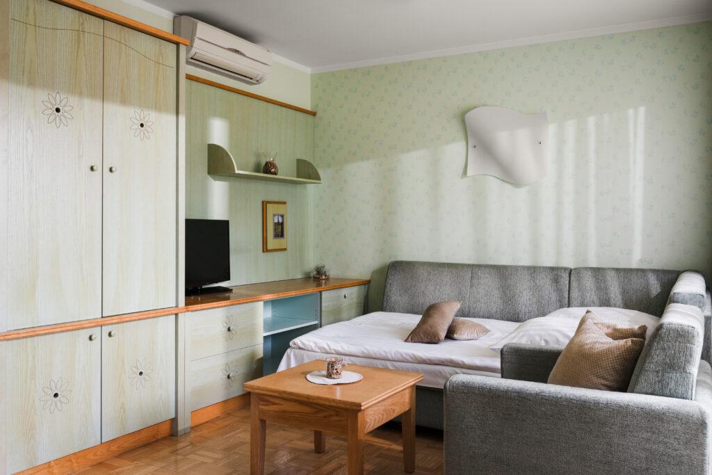 Apartmány mají ložnici s manželskou postelí a obývací pokoj s rozkládacím gaučem, který lze využít jako přistýlku. Gauč má šířku 140 cm a je proto vhodný spíše pro mladší děti nebo jednu dospělou osobu a 1 dítě.
